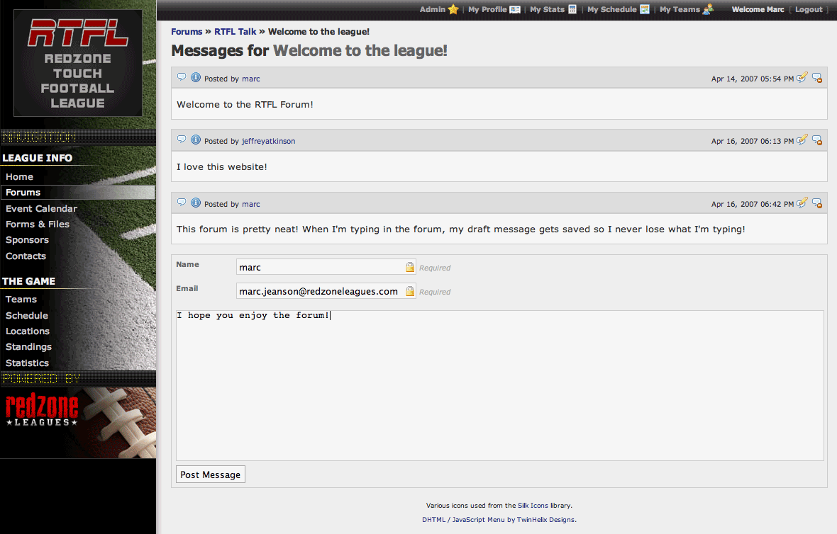All Redzone League websites also come with built in Forums. Forums are an easy way to communicate to your membership and to have your membership communicate with each other. The forum is integrated into your membership database, so only registered people can post to your forums. As a league administrator, you have complete control over your forums.