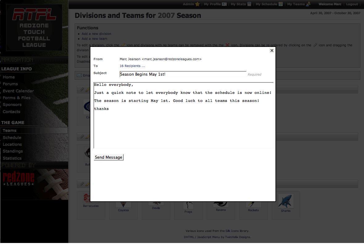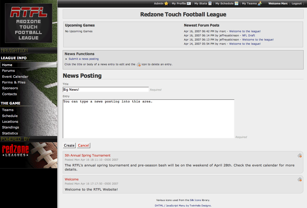 Administrators can post news items to the home page of all Redzone sites. This is a great way to post announcements to the league or anything else you want to share with your membership.